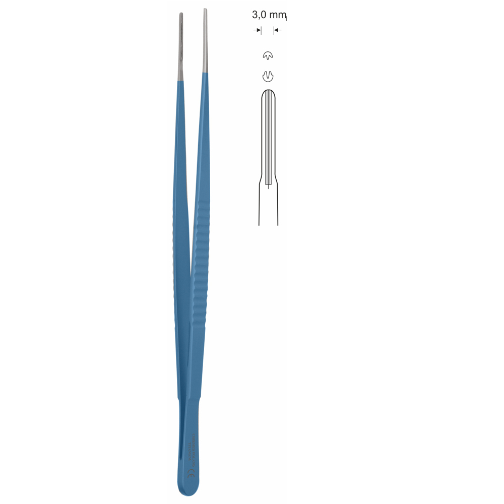 Pinceta atraumatyczna typu DE BAKEY, dł. 240 mm, czubek zwężany 3 mm, 1×2 ząbki, długość przefrezowania typu DE BAKEY od czubka na długości 20-25 mm, prosta, z tytanu