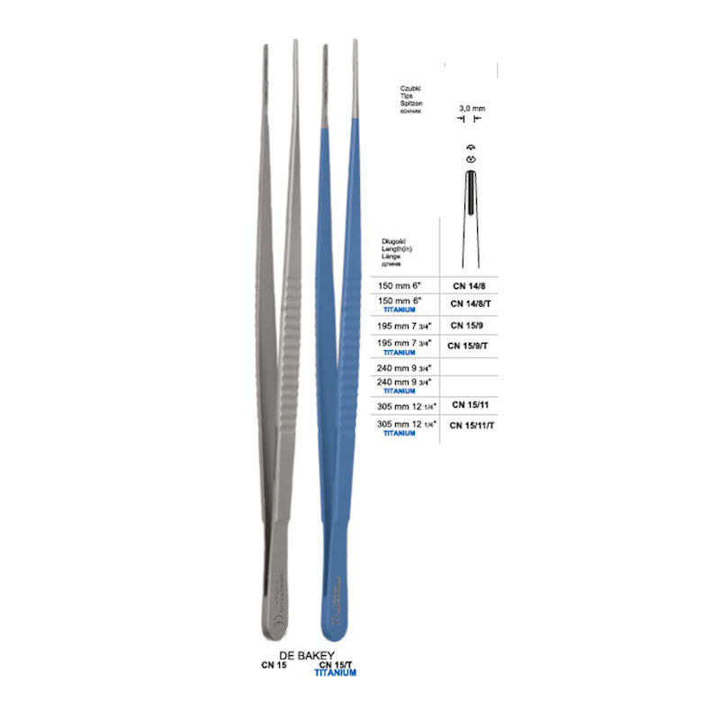 Pinceta atraumatyczna typu DE BAKEY, dł. 195 mm, czubek 3 mm, 1×2 ząbki, długość przefrezowania typu DE BAKEY od czubka na długości 20-25 mm, prosta