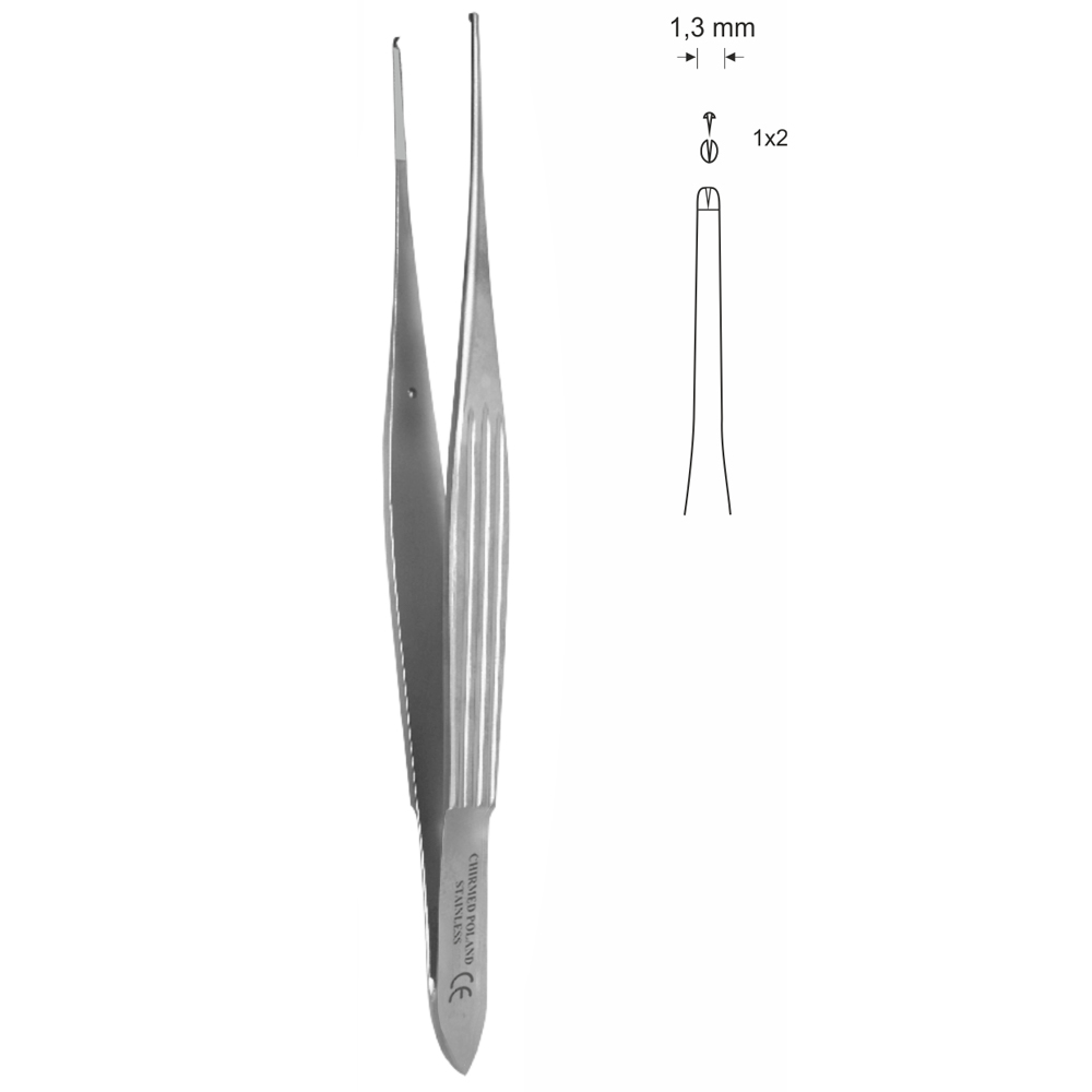 Pinceta chirurgiczna typu MC INDOE, dł. 160 mm, czubek 1,3 mm, 1×2 ząbki, prosta
