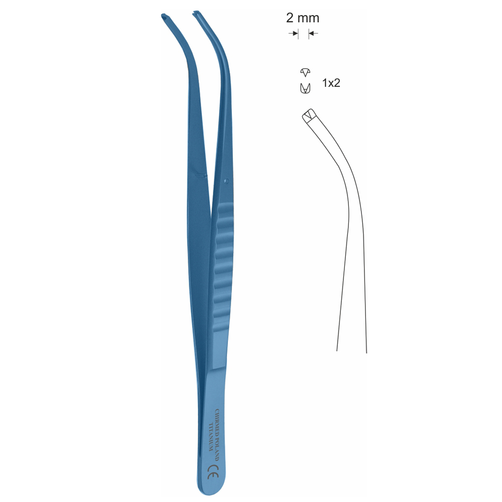 Pinceta chirurgiczna, dł. 165 mm, czubek 2 mm, 1×2 ząbki, odgięta, z tytanu