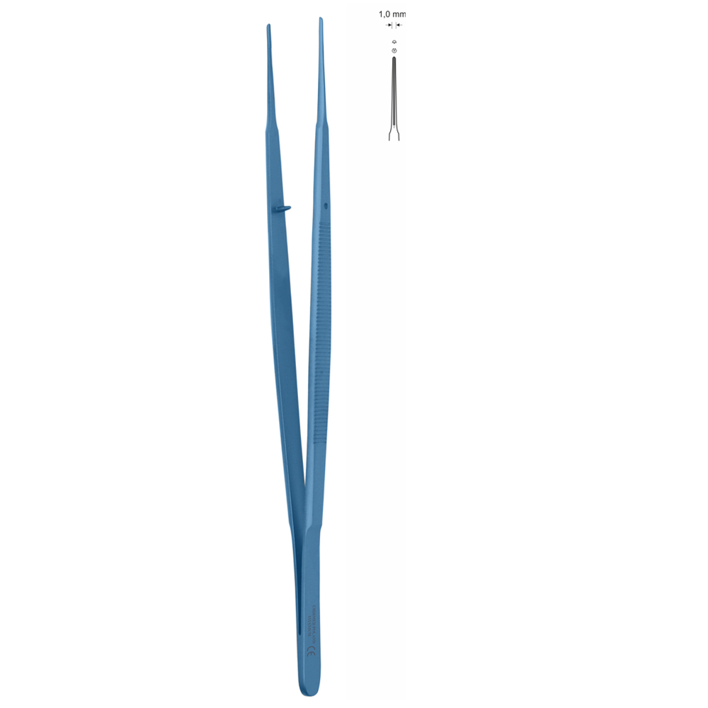 Pinceta typu GERALD, dł. 210 mm, czubek typu DE BAKEY 1 mm, z nasypem diamentowym, długość przefrezowania typu DE BAKEY od czubka na długości 20-25 mm, prosta, z tytanu