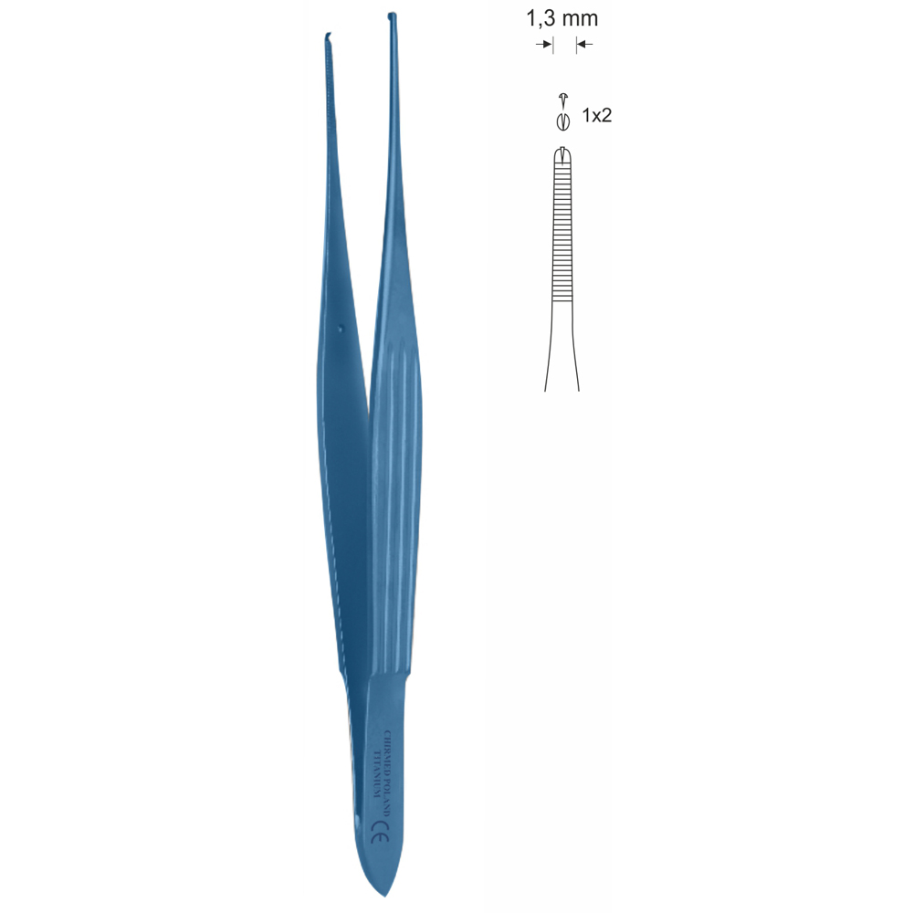 Pinceta chirurgiczna typu MC INDOE, dł. 155 mm, czubek 1,3 cm, 1×2 ząbki, prosta, z tytanu