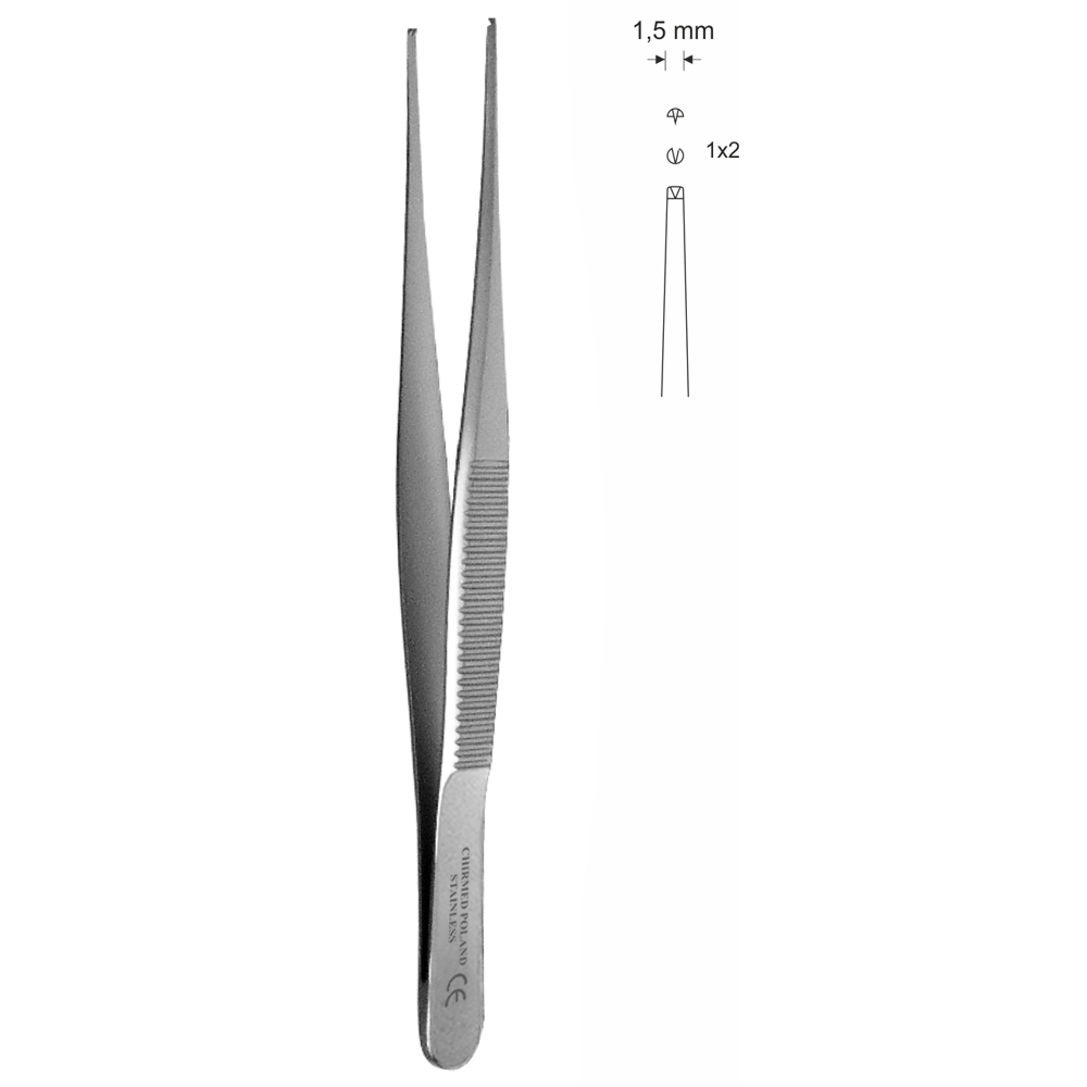 Pinceta chirurgiczna, dł.130 mm, czubek 1,5 mm, 1×2 ząbki, prosta