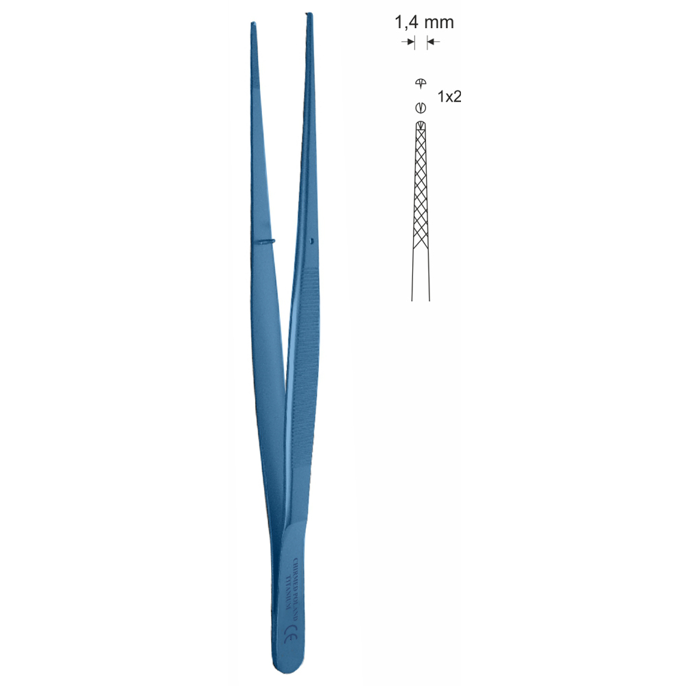 Pinceta do opon mózgowych typu WAUGH, z krzyżowymi nacięciami, dł. 180 mm, czubek 1,4 mm, 1×2 ząbki, prosta, z tytanu