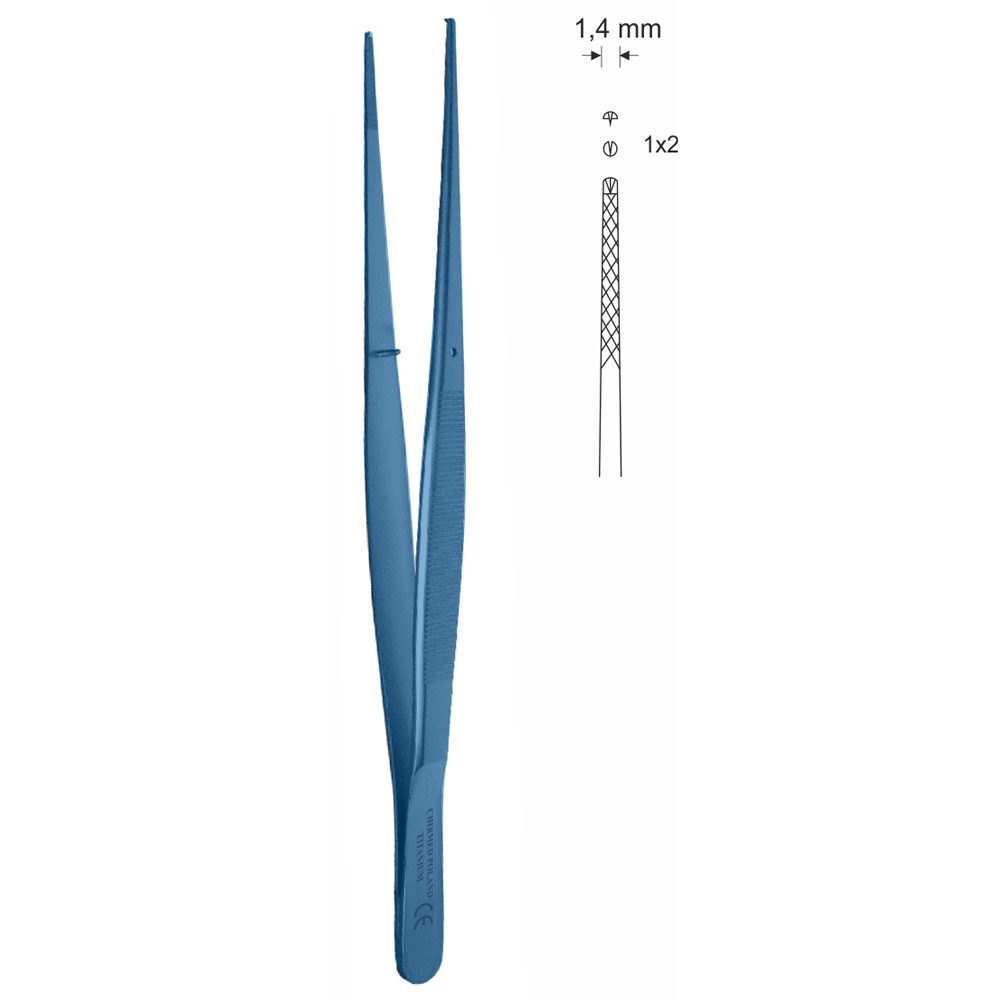 Pinceta do opon mózgowych typu WAUGH, z krzyżowymi nacięciami, dł. 200 mm, czubek 1,4 mm, 1×2 ząbki, prosta, z tytanu