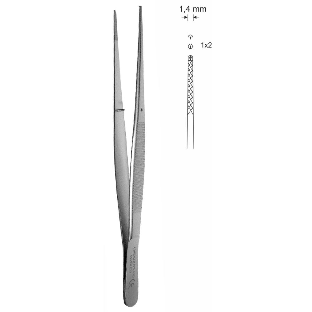 Pinceta do opon mózgowych typu WAUGH, z krzyżowymi nacięciami, dł. 200 mm, czubek 1,4 mm, 1×2 ząbki, prosta