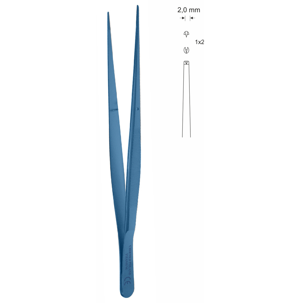 Pinceta chirurgiczna z włąskimi czubkami, dł. 200 mm, czubek 2 mm, 1×2 ząbki, prosta, z tytanu