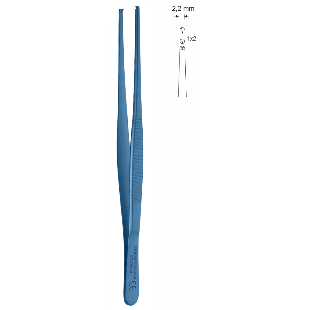 Pinceta chirurgiczna typu MEDIUM, dł. 130 mm, czubek 2,2 mm, 1×2 ząbki, prosta, z tytanu