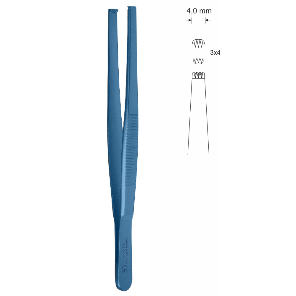 Pinceta chirurgiczna, dł. 145 mm, czubek 4 mm, 3×4 ząbki, prosta, z tytanu