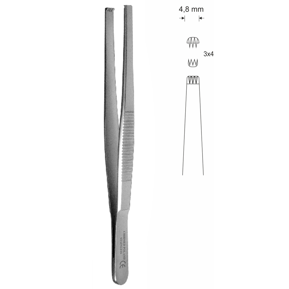 Pinceta chirurgiczna, dł. 200 mm, czubek 4,8 mm, 3×4 ząbki, prosta