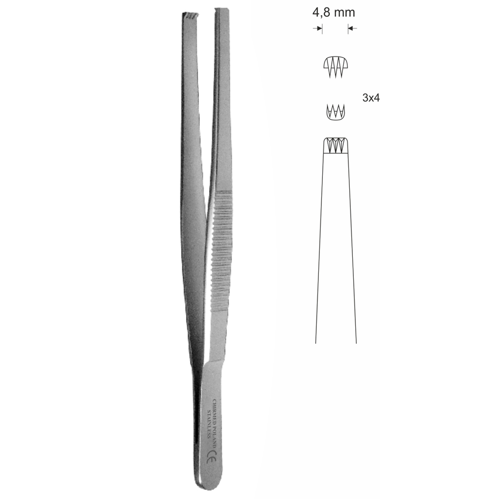 Pinceta chirurgiczna, dł. 250 mm, czubek 4,8 mm, 3×4 ząbki, prosta
