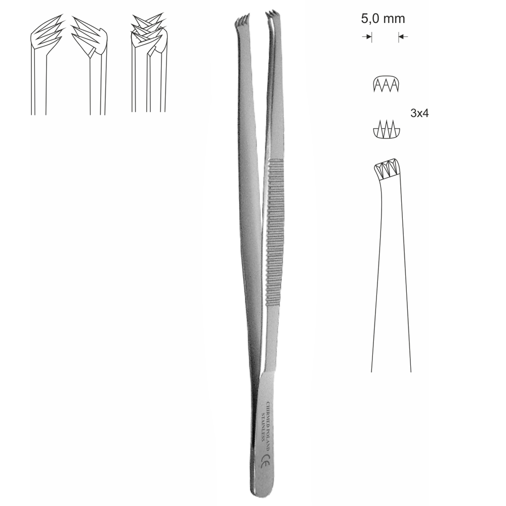 Pinceta adaptacyjna skośna, dł. 145 mm, czubek 5 mm, 3×4 ząbki, prosta