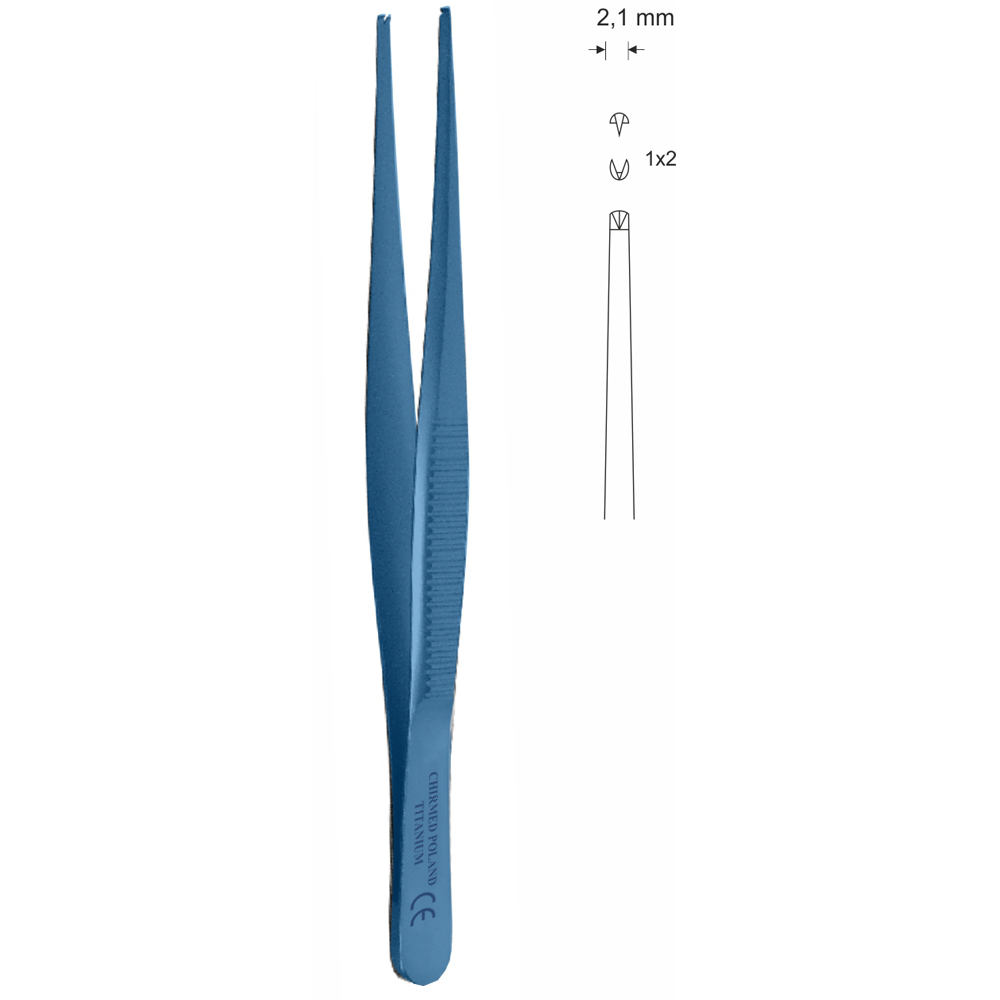 Pinceta chirurgiczna, dł. 130 mm, czubek 2,1 mm, 1×2 ząbki, prosta, z tytanu