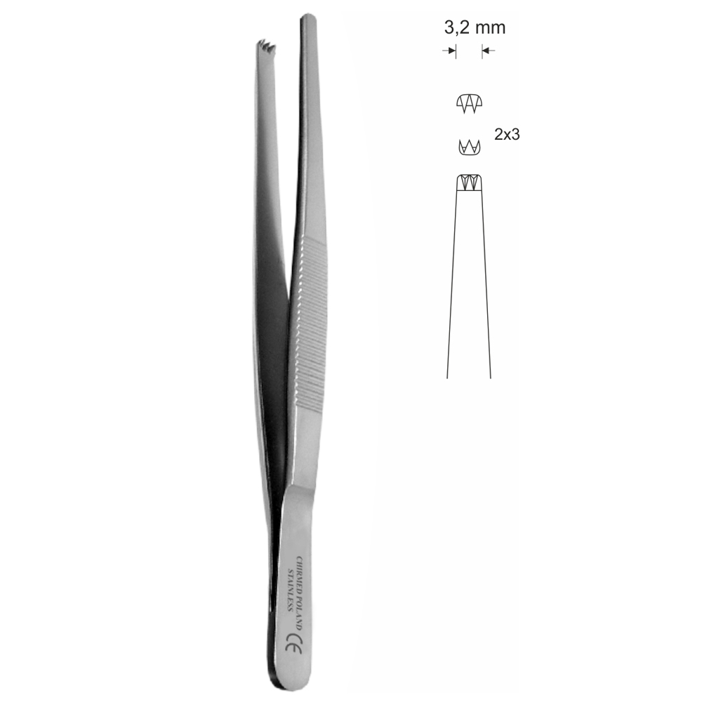 Pinceta chirurgiczna, dł. 145 mm, czubek 3,2 mm, 2×3 ząbki, prosta