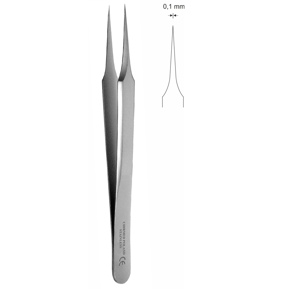 Pinceta mikrochirurgiczna bez nacięć i bez ząbków, bez moletu, model szwajcarski (jubilerski), dł. 115 mm, czubek 0,1 mm, prosta