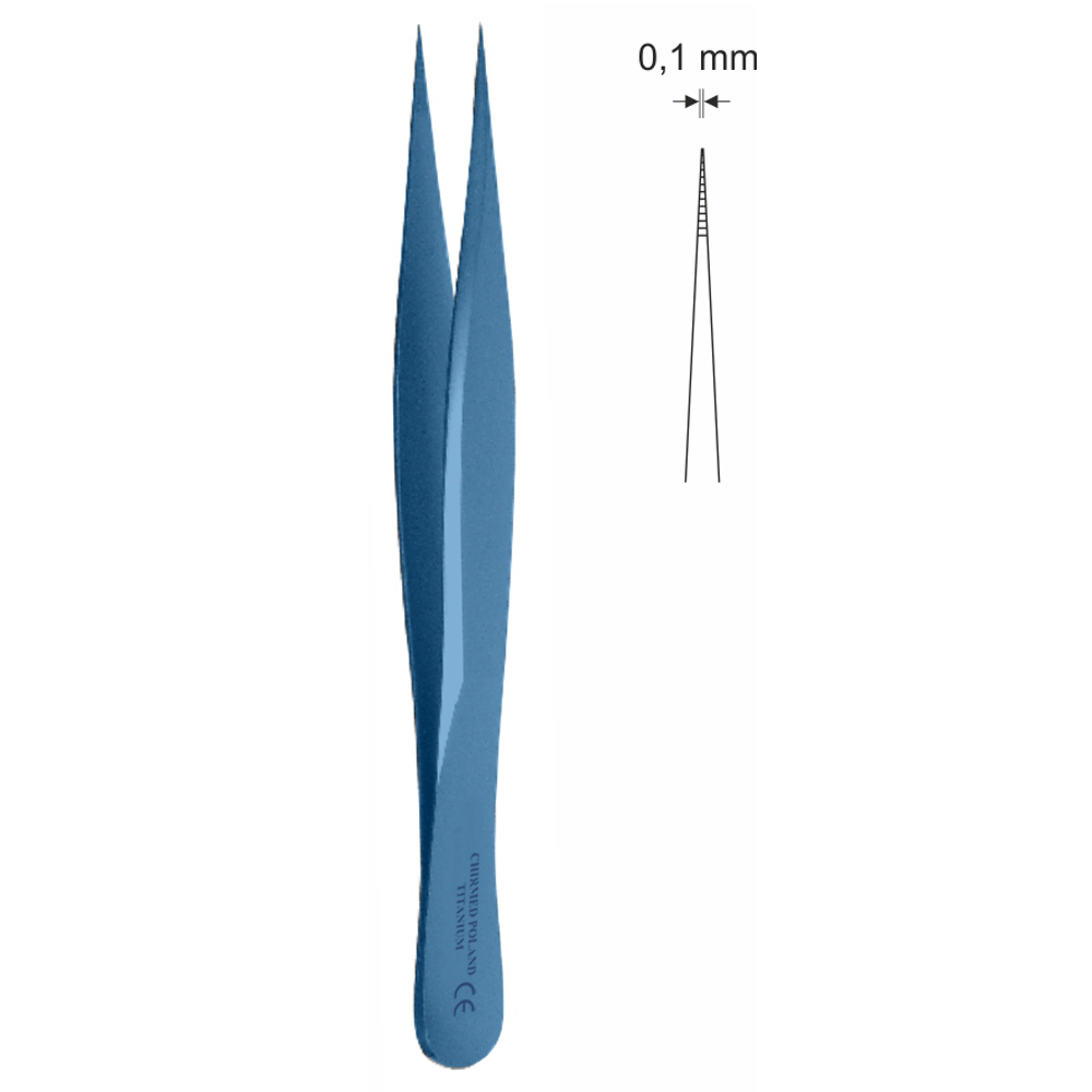 Pinceta mikrochirurgiczna z nacięciami, model jubilerski, bez moletu, dł. 100 mm, czubek 0,1 mm, prosta, z tytanu