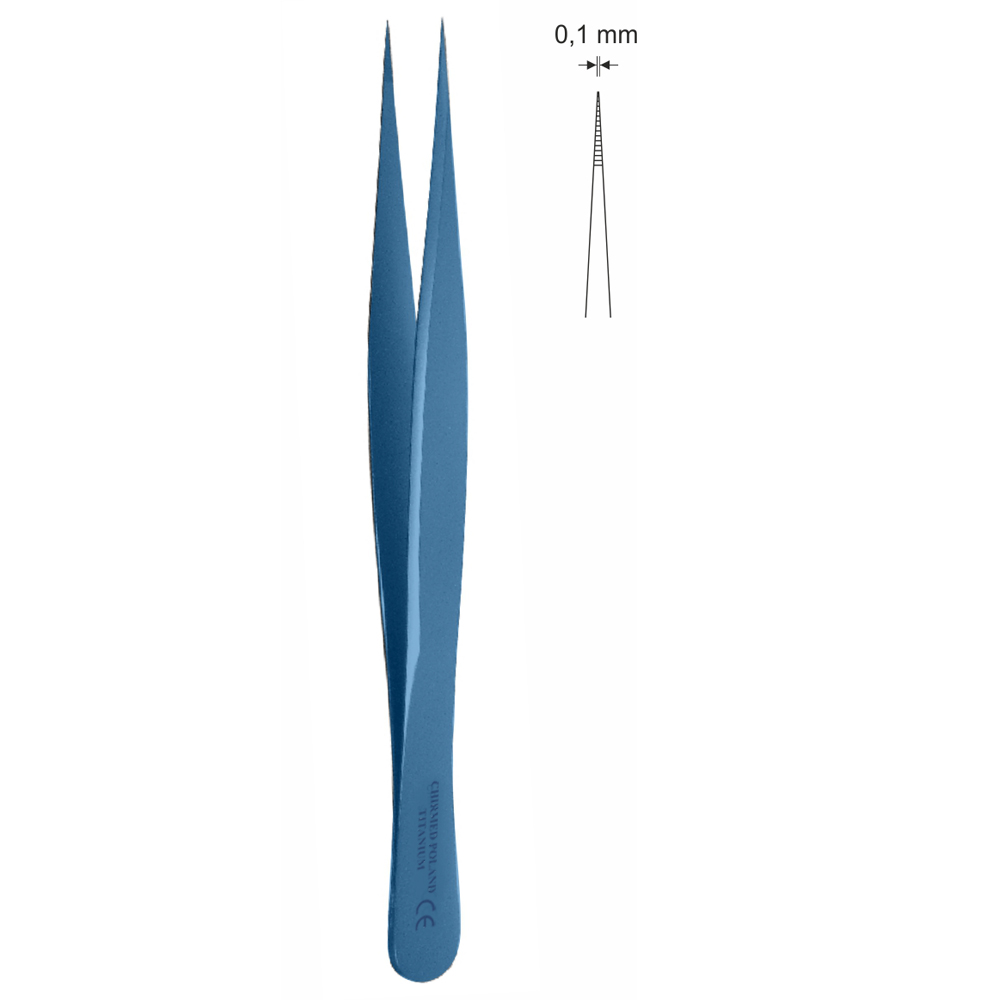 Pinceta mikrochirurgiczna z nacięciami, model jubilerski, bez moletu, dł. 130 mm, czubek 0,1 mm, prosta, z tytanu