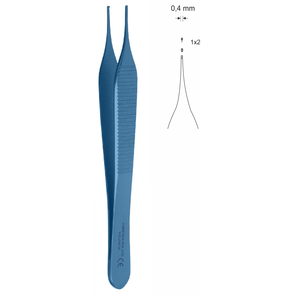 Pinceta mikrochirurgiczna typu MIKRO-ADSON, dł. 105 mm, czubek 0,4 mm, 1×2 ząbki, prosta z tytanu