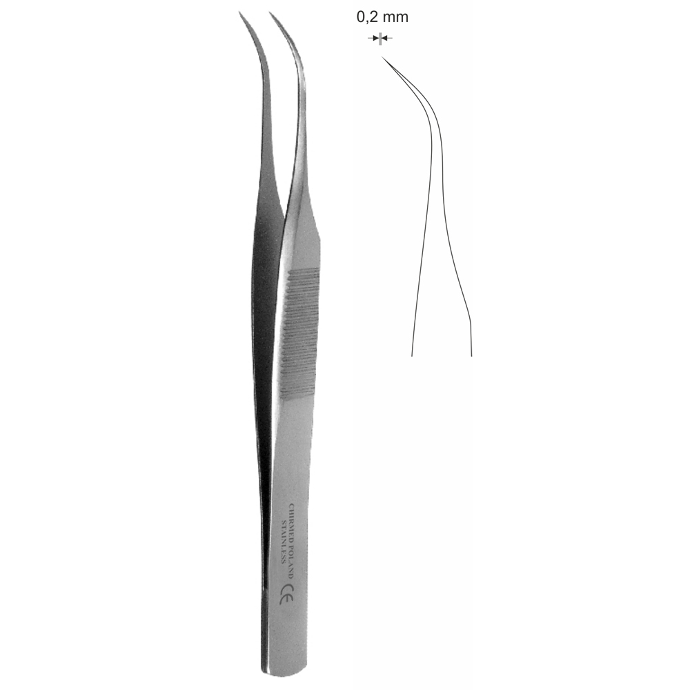 Pinceta mikrochirurgiczna bez nacięć i bez ząbków, model szwajcarski (jubilerski), dł. 110 mm, czubek 0,2 mm, odgięta