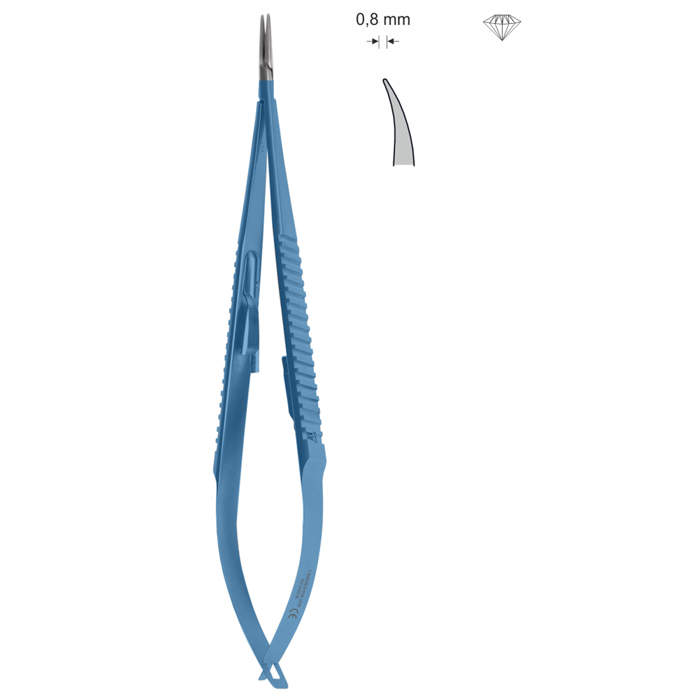 Igłotrzymacz mikrochirurgiczny typu CASTROVIEJO, z zamkiem, dł. 150 mm, czubek 0,8 mm, z nasypem diamentowym, odgięte, z tytanu