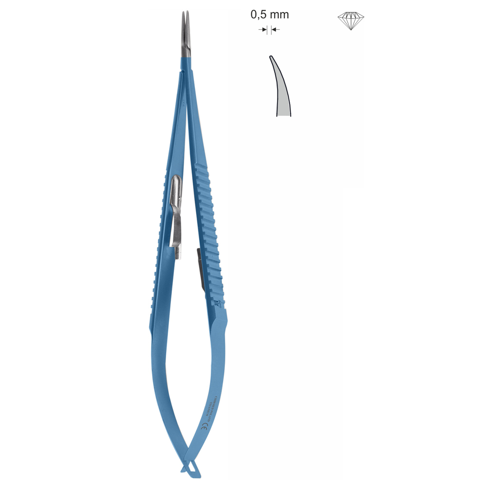 Igłotrzymacz mikrochirurgiczny typu CASTROVIEJO, z tytanu, z zamkiem ze stali nierdzewnej, dł. 150 mm, czubek 0,5 mm, z nasypem diamentowym , odgięte