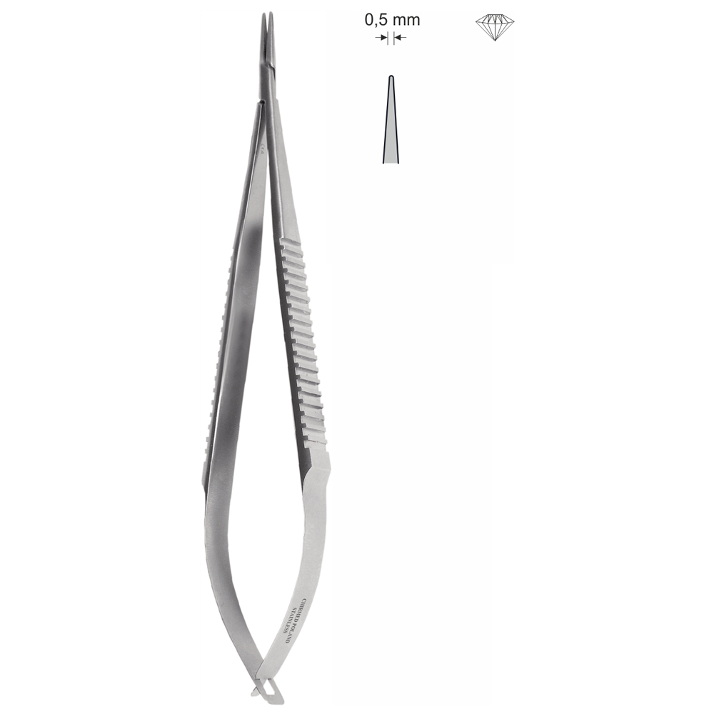 Igłotrzymacz mikrochirurgiczny typu CASTROVIEJO, dł. 150 mm, czubek 0,5 mm, z nasypem diamentowym, proste