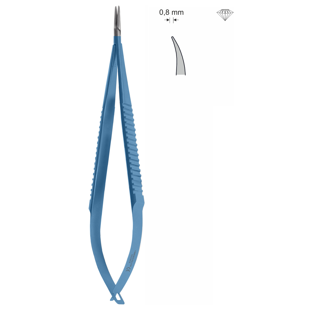 Igłotrzymacz mikrochirurgicznytypu CASTROVIEJO, dł. 150 mm, czubek 0,8 mm, z nasypem diamentowym, odgięte, z tytanu
