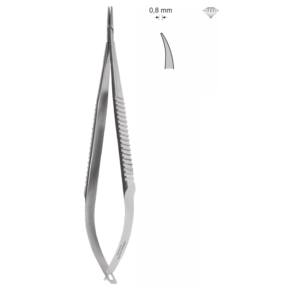 Igłotrzymacz mikrochirurgiczny typu CASTROVIEJO, dł. 150 mm, czubek 0,8 mm, z nasypem diamentowym , odgięte