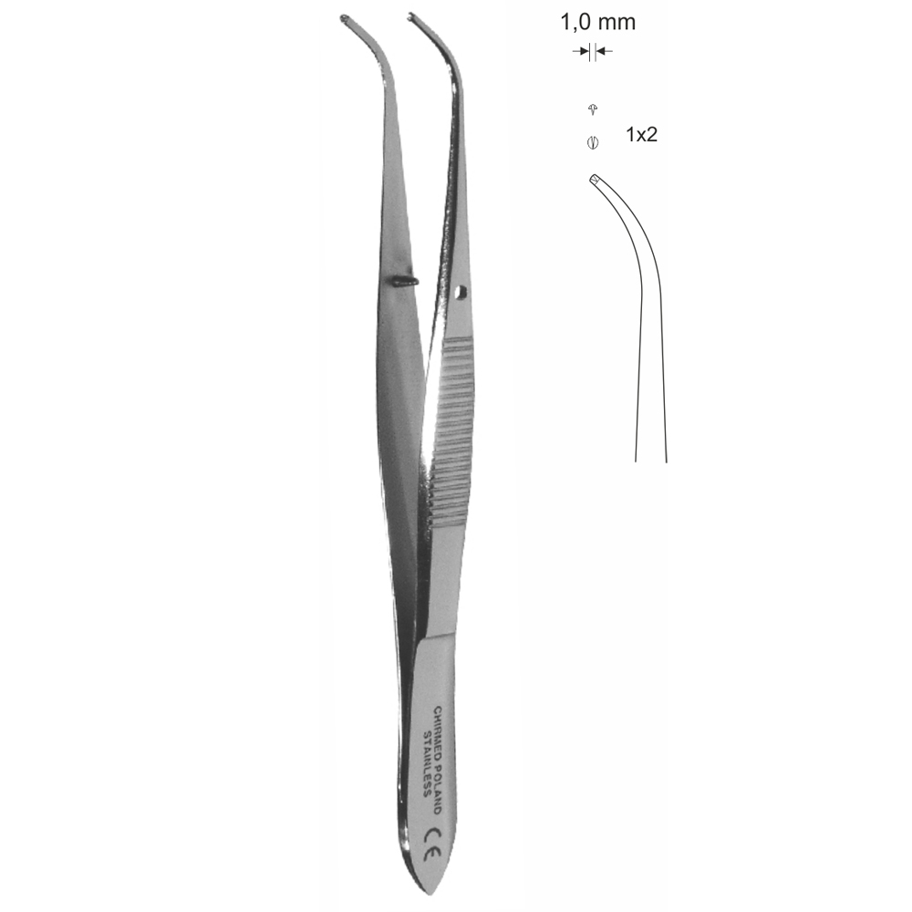 Pinceta do tęczówki, chirurgiczna, dł. 100 mm, czubek 1 mm, 1×2 ząbki, lekko odgięta