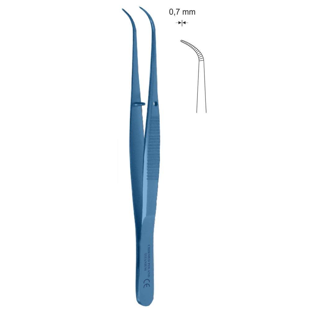 Pinceta okulistyczna, anatomiczna, dł. 100 mm, czubek 0,7 mm, odgięta, z tytanu