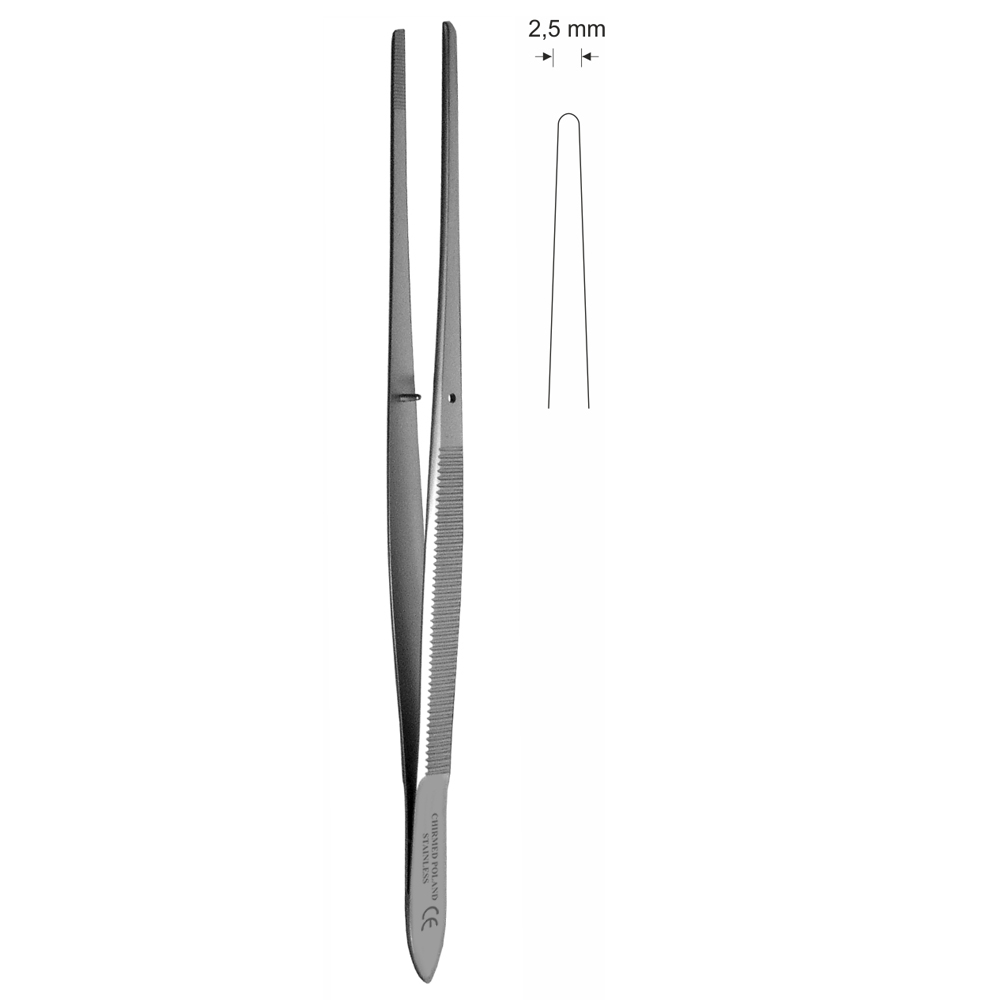 Pinceta stomatologiczna, anatomiczna, bez nacięć i bez ząbków, z kołkiem naprowadzającym, dł. 160 mm, czubek 2,5 mm, prosta