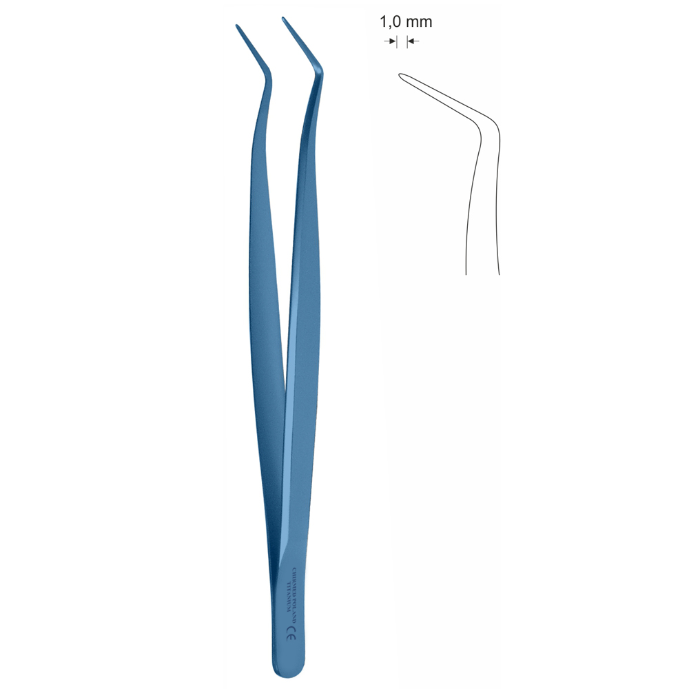 Pinceta stomatologiczna, anatomiczna, bez nacięć i bez ząbków, dł. 160 mm, czubek 1 mm, odgięta, z tytanu