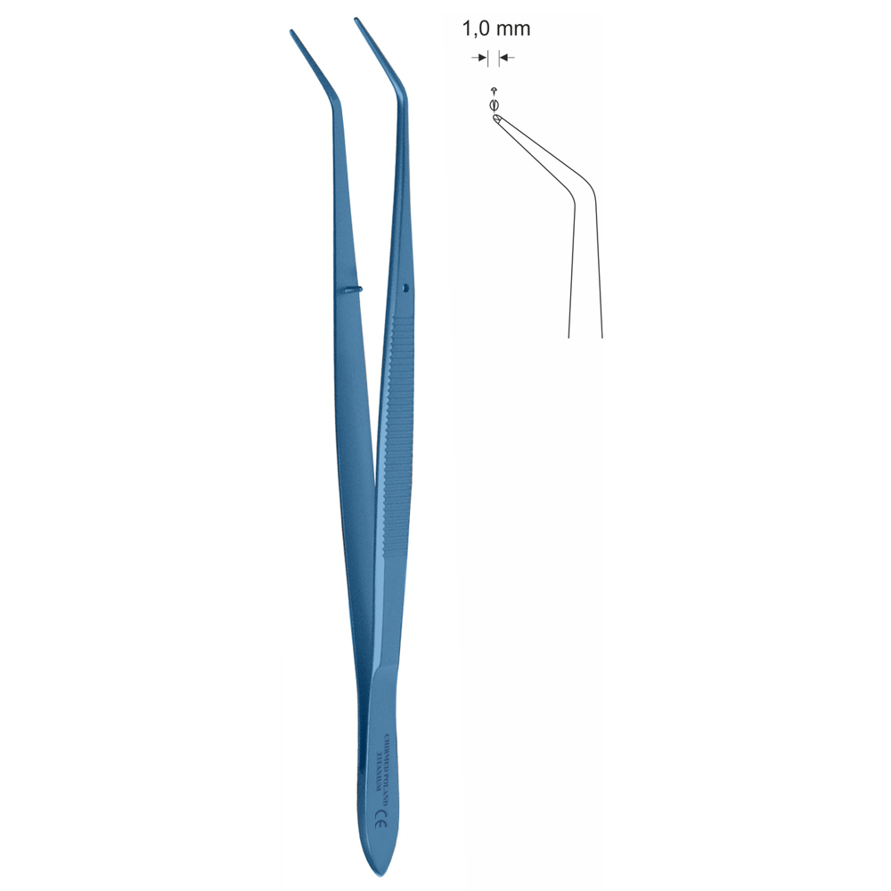 Pinceta chirurgiczna do gingiwektomii, do nakłuwania dziąsła, z kołkiem naprowadzającym, dł. 160 mm, czubek 1 mm, 1×2 ząbki, odgięta, z tytanu