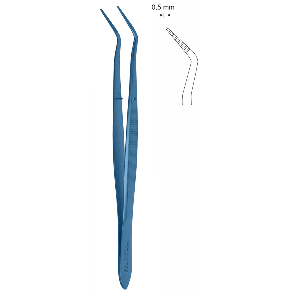 Pinceta stomatologiczna, anatomiczna, z kołkiem naprowadzającym, dł 160 mm, czubek 0,5 mm, podwójnie odgięta, z tytanu