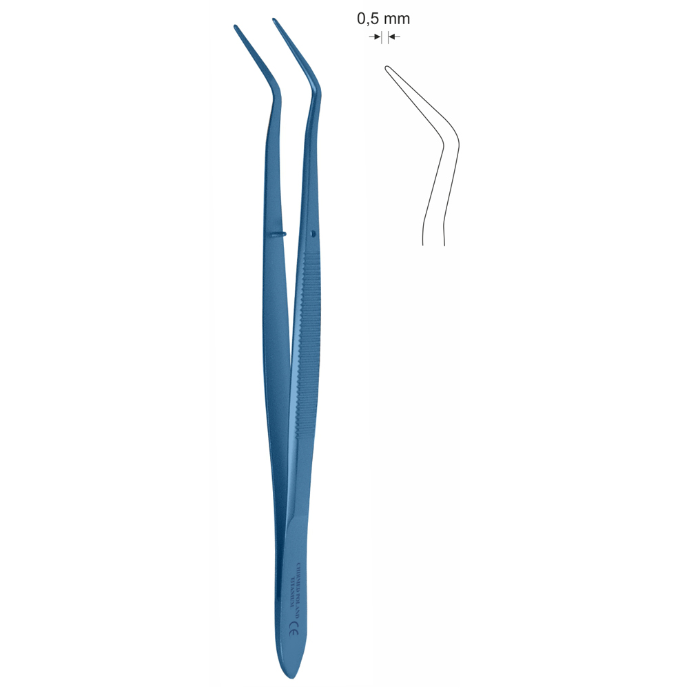 Pinceta stomatologiczna, anatomiczna, bez nacięć i bez ząbków, z kołkiem naprowadzającym, dł 160 mm, czubek 0,5 mm, podwójnie odgięta, z tytanu