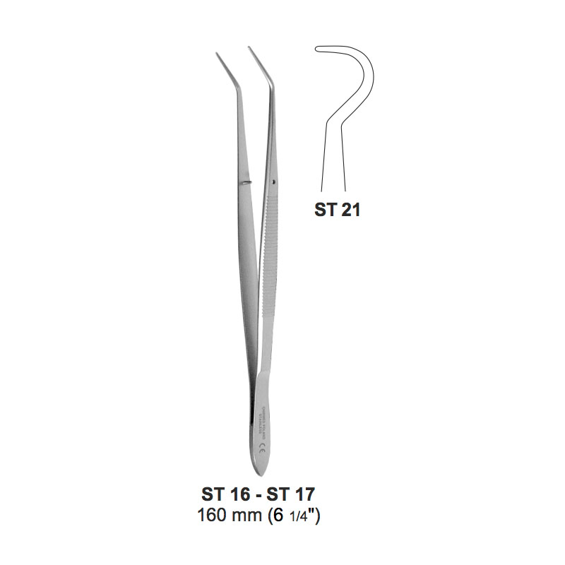 Pinceta stomatologiczna, z kołkiem naprowadzającym, końcówka w kształcie sierpu, bez nacięć i bez ząbków, dł. 160 mm, czubek 0,5 mm