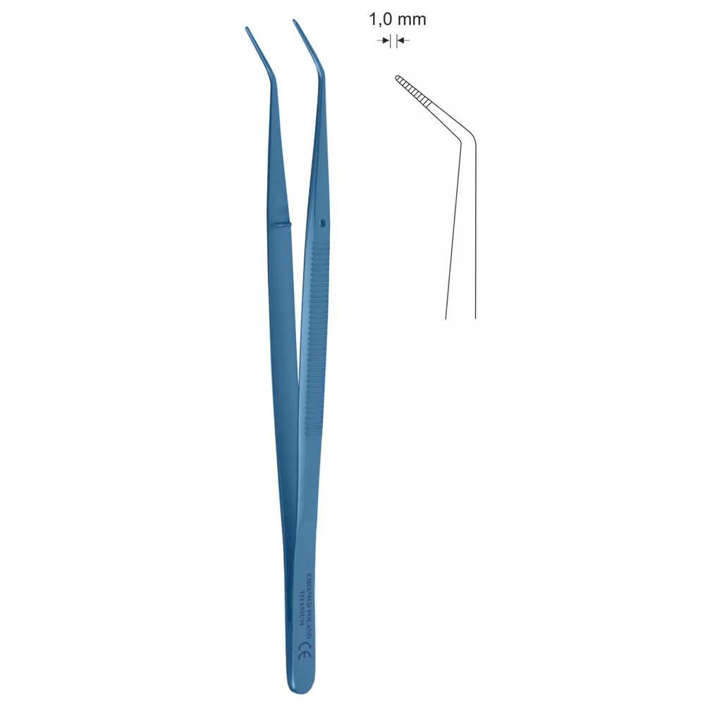Pinceta stomatologiczna typu COLLEGE, anatomiczna, z kołkiem naprowadzającym, nacięcia do połowy części pracującej, dł. 150 mm, czubek 1 mm, odgięta, z tytanu