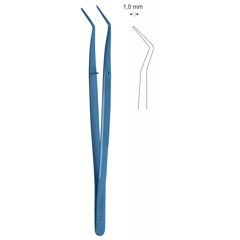 Pinceta stomatologiczna typu COLLEGE, anatomiczna, z kołkiem naprowadzającym, bez nacięć i bez ząbków, dł. 150 mm, czubek 1 mm, podwójnie odgięta, z tytanu