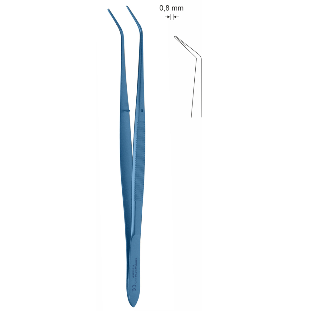 Pinceta stomatologiczna typu FLAGG, anatomiczna, z kołkiem naprowadzającym, nacięcia do połowy części pracującej, dł. 160 mm, czubek 0,8 mm, odgięta, z tytanu