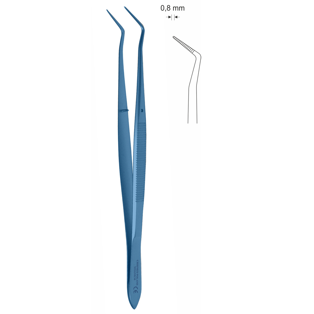 Pinceta stomatologiczna typu MERIAM, anatomiczna, z kołkiem naprowadzającym, dł. 160 mm, czubek 0,8 mm, podwójnie odgięta, z tytanu