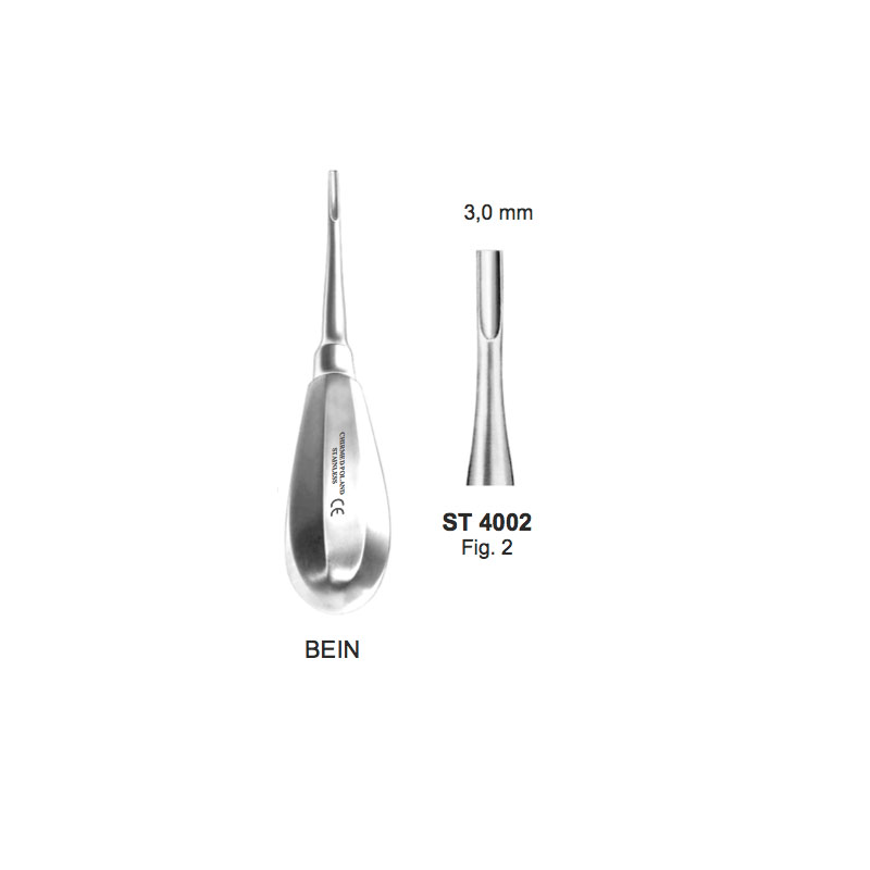 Dźwignia stomatologiczna zaokrąglona, do korzeni górnych, z uchwytem typu BEIN, końcówka ścięta, dł. 130 mm, szer. 3 mm, Fig. 2, prosta