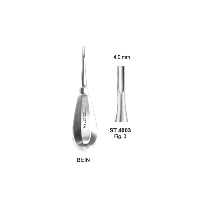 Dźwignia stomatologiczna zaokrąglona, do korzeni górnych, z uchwytem typu BEIN, końcówka ścięta, dł. 130 mm, szer. 4 mm, Fig. 3, prosta