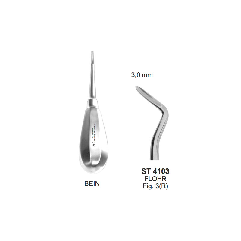 Dźwignia stomatologiczna typu FLOHR, do korzeni bocznych, z uchwytem typu BEIN, dł. 130 mm, szer. 3 mm, prawa, Fig. 3, zagięta