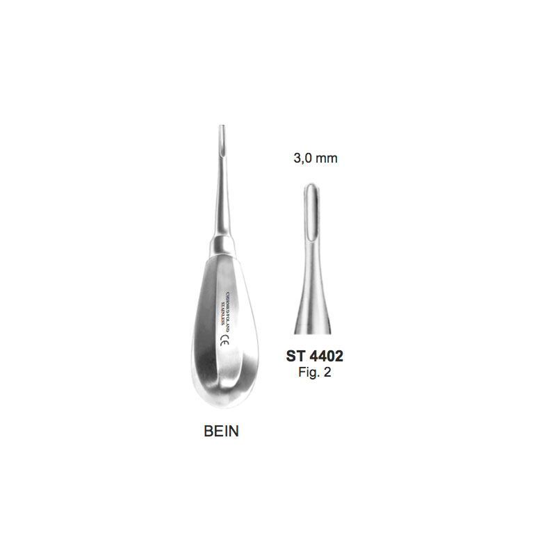 Dźwignia stomatologiczna zaokrąglona, do korzeni górnych, z uchwytem typu BEIN, końcówka zaokrąglona, dł. 130 mm, szer. 3 mm, Fig. 2, prosta